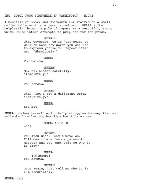 In happier news, Larry Flynt (editor of Hustler) has kindly posted the entire “script” of Who’s Nailin’ Paylin? (Warning: not safe for work, and opens with a particularly hideous image of something that is evidently a woman, although I don’t know how many of her original body parts are still around.) You may be surprised to discover that porn films have “scripts” at all, and indeed the genre is unusual—among other things, the sex scenes are entirely unscripted—only the incidental actions and dialogue is. But some of it is pretty funny, particularly this scene between Serra Paylin and an intern attempting to get her ready for interviews and debates:
