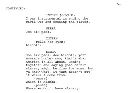 Paylin eventually leaves, and it turns out First Dude was hiding under the bed the whole time, waiting for Intern. Some of the other dialogue is pretty funny, although one can hardly imagine the comic timing and deft acting that actually appear in the actual film.